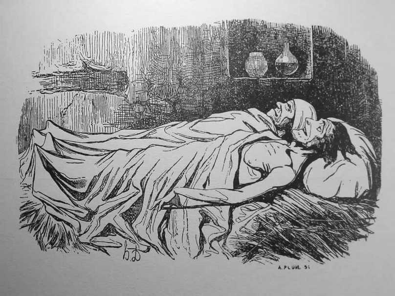 Daumier, Honoré Victorin: Où deux à deux blottis..., chacun heurte en tremblant son compagnon de lit. Die Krankenhäuser. U. a. Bibliothèque Nationale de France, Cabinet des Estampes, Paris, Nachdruck um 1840. © www.daumier.org (DR 5373)