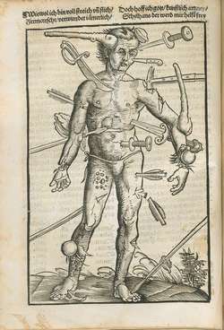 Wundenmann, in: Gerdorff, Hans von: Feldbuch der Wundartzney, Straßburg 1517. © BSB München: urn:nbn:de:bvb:12-bsb00107489-0 (CC BY-NC-SA 4.0). https://creativecommons.org/licenses/by-nc-sa/4.0/deed.de [Ränder beschnitten].